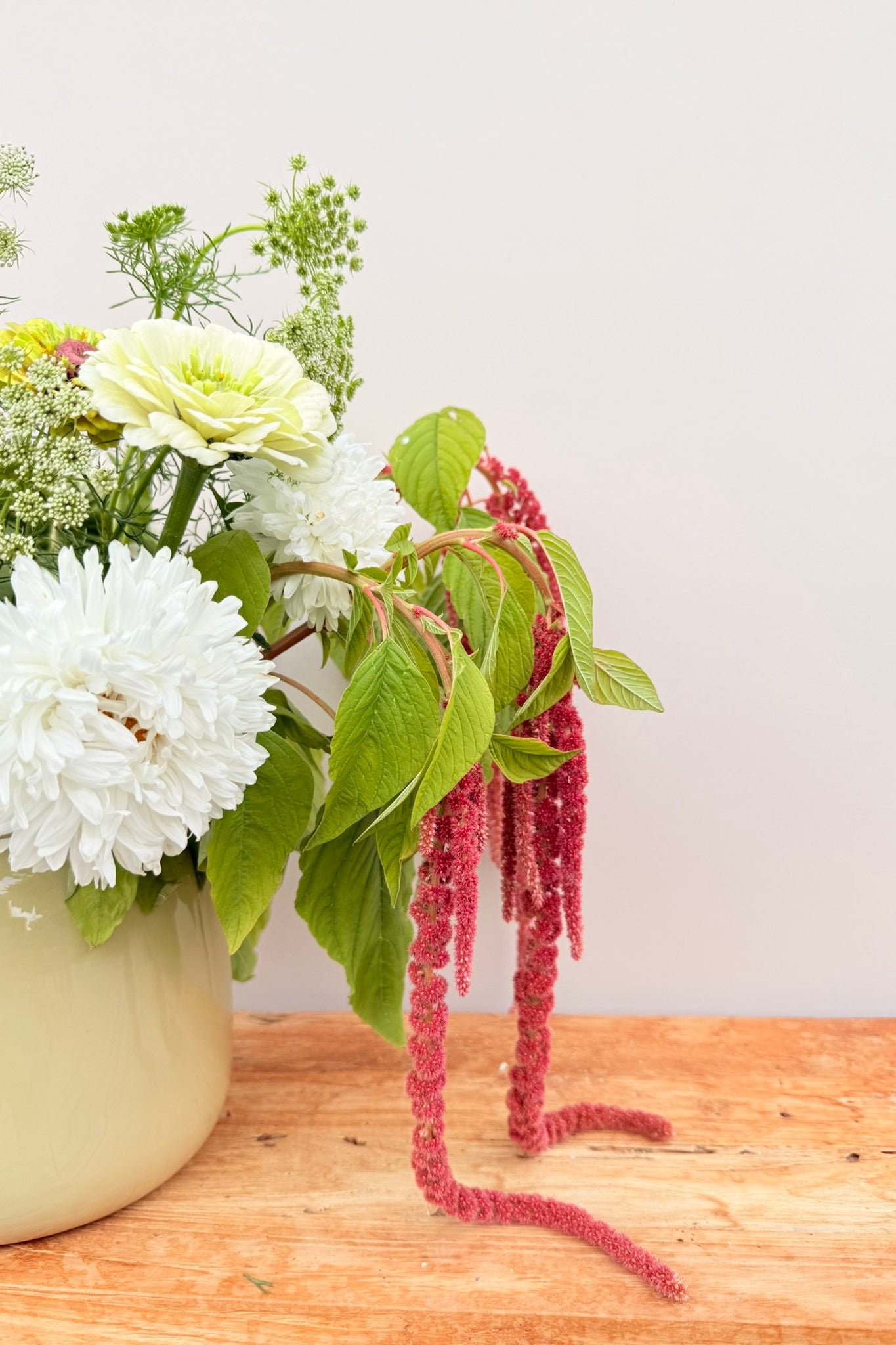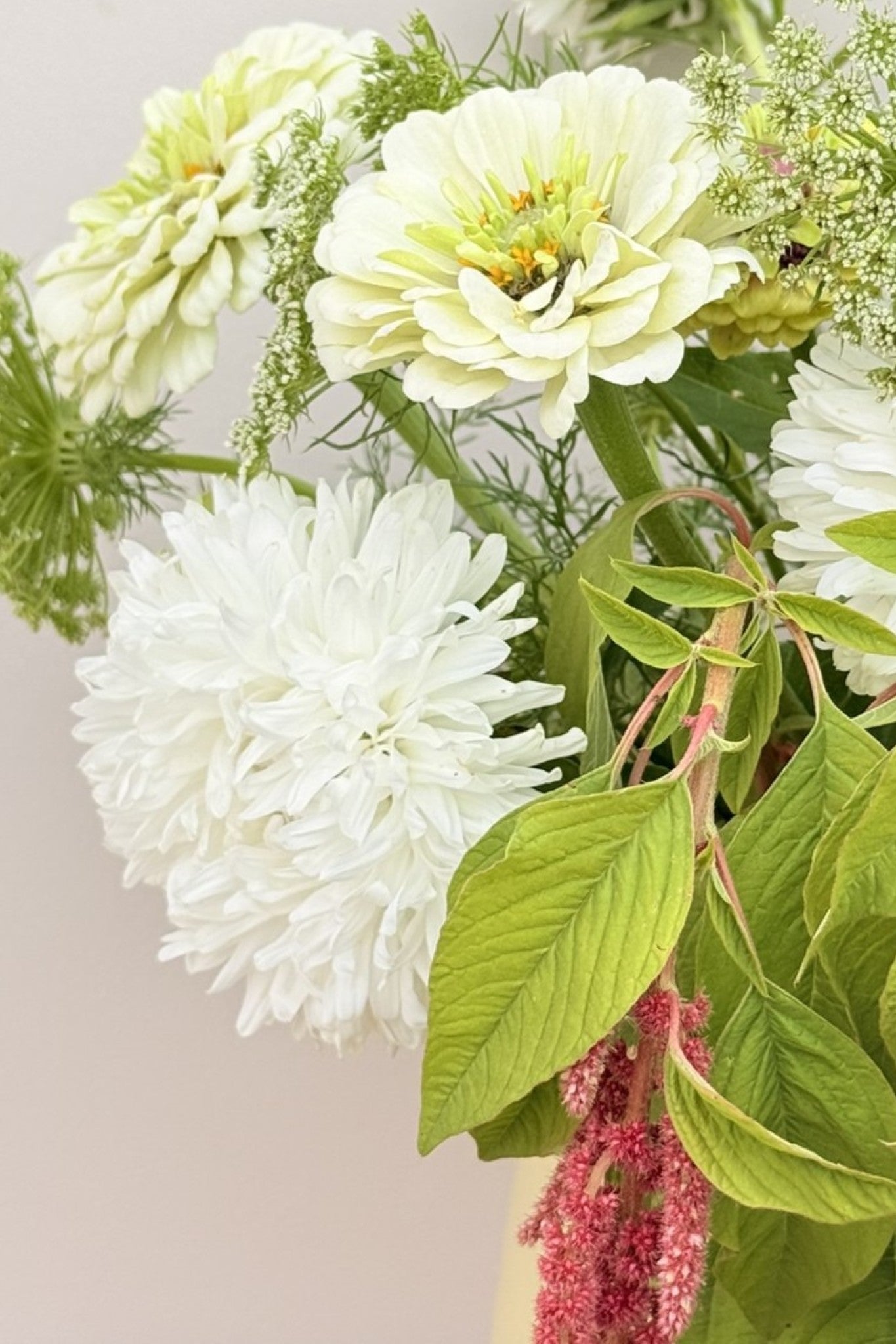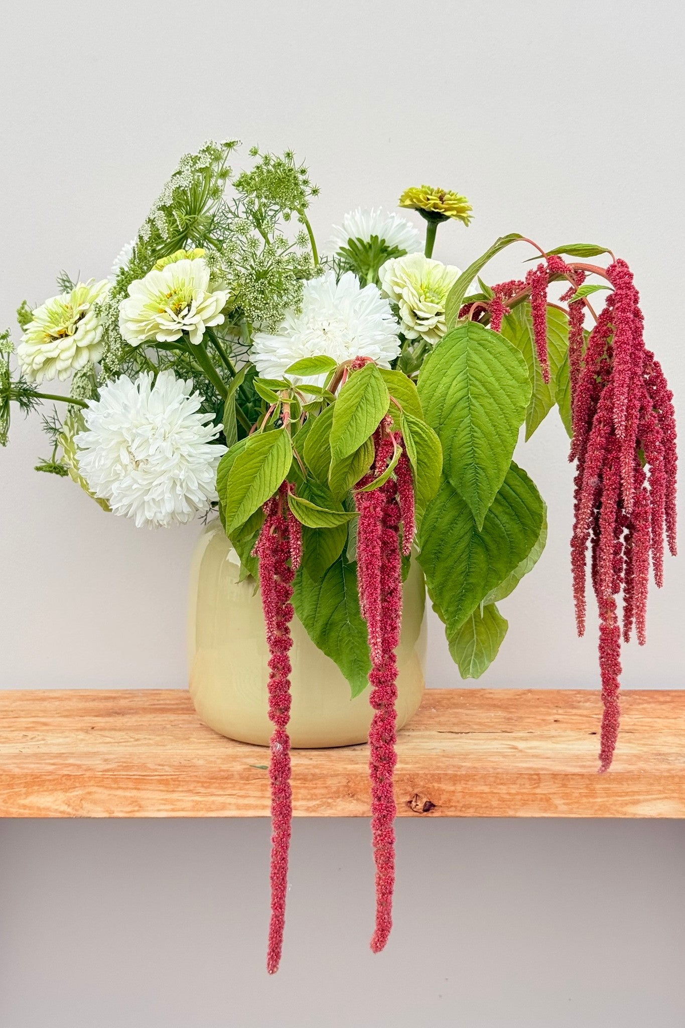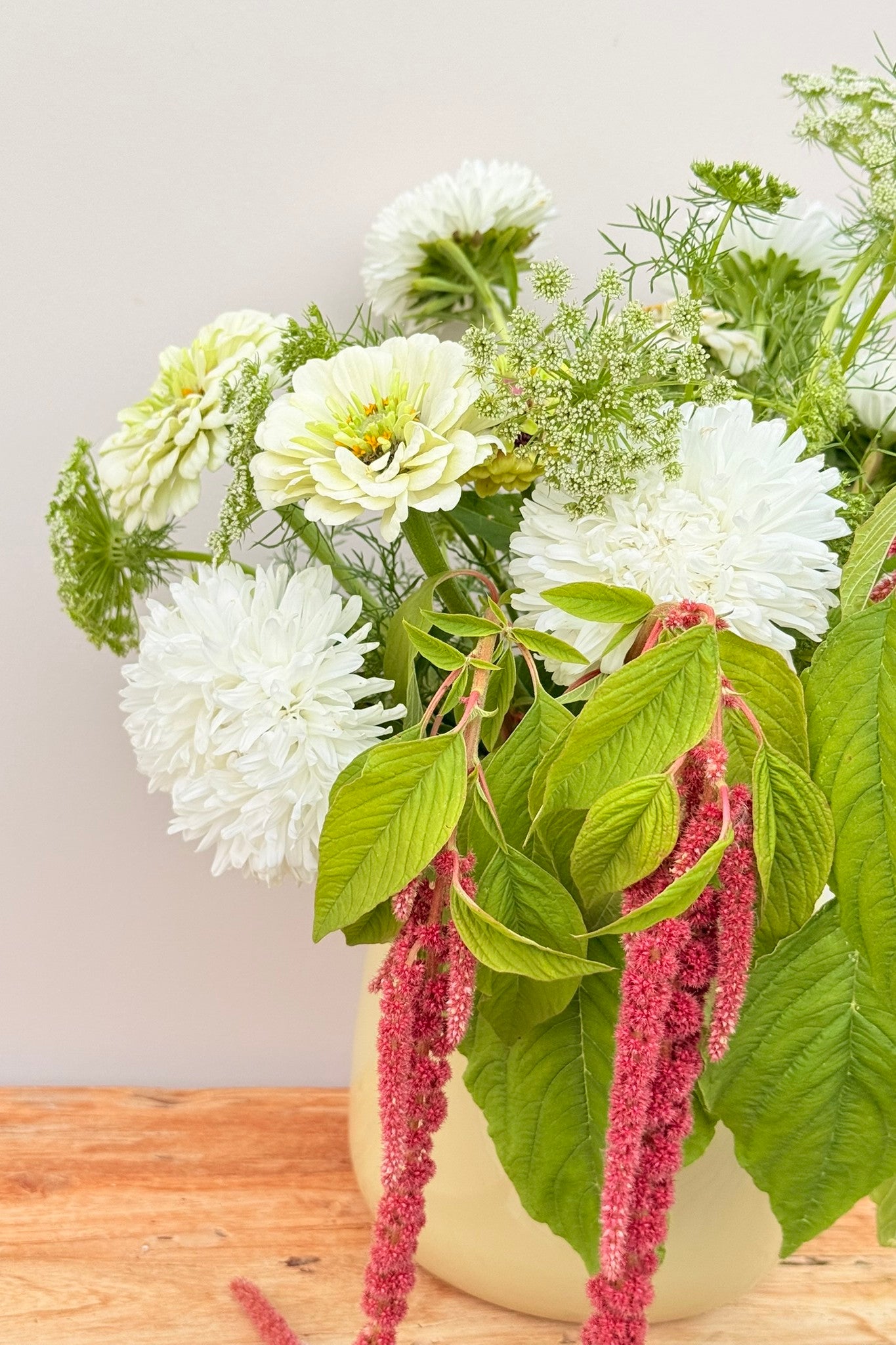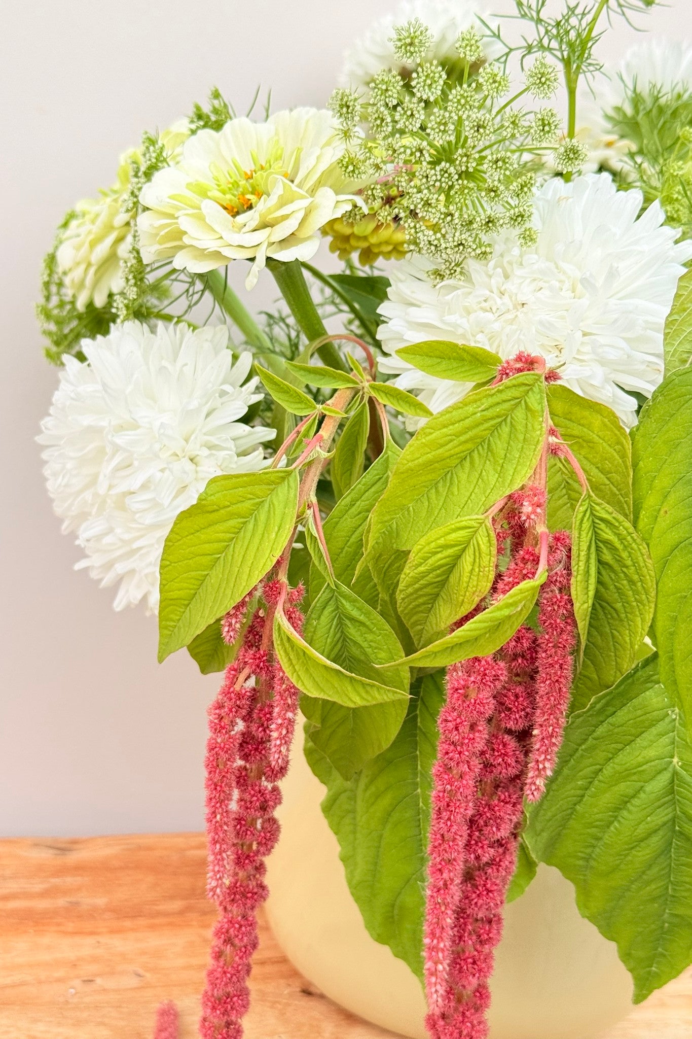 Whimsy Waterfall-buketten har et roligt og afdæmpet udtryk, hvor hvide og grønne nuancer danner helheden, og den smukke amarant får lov at træde i karakter. Sommerasters ’King Size White’ og frøkenhat ’Polar Bear’ giver store blomsterhoveder i hvidt, der danner den lyse base. Frøkenhat ’Queen Lime Blotch’ tilfører et limegrønt skær, som harmonerer med Tandstikkerurt ’Green Mist’, der lægger sig let og luftigt omkring de større blomster og skaber bevægelse. Amarant ’Coral Fountain’ fuldender buketten med sine hængende blomster i varme koraltoner, som giver en markant og elegant kontrast.