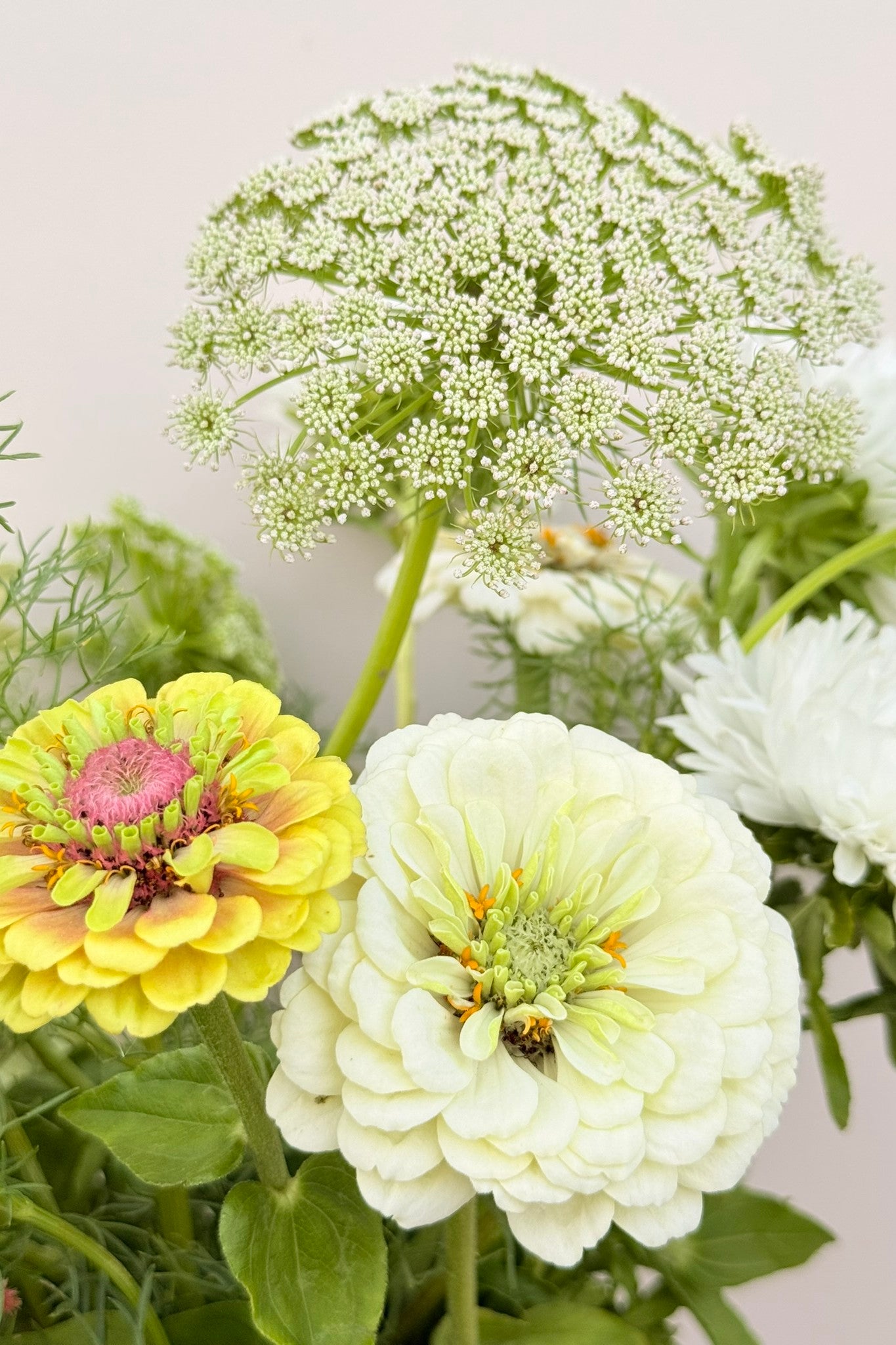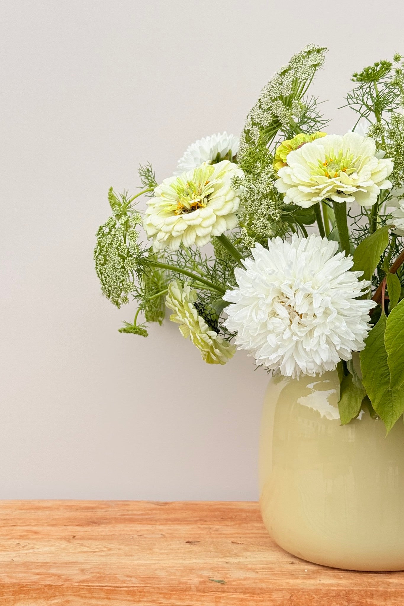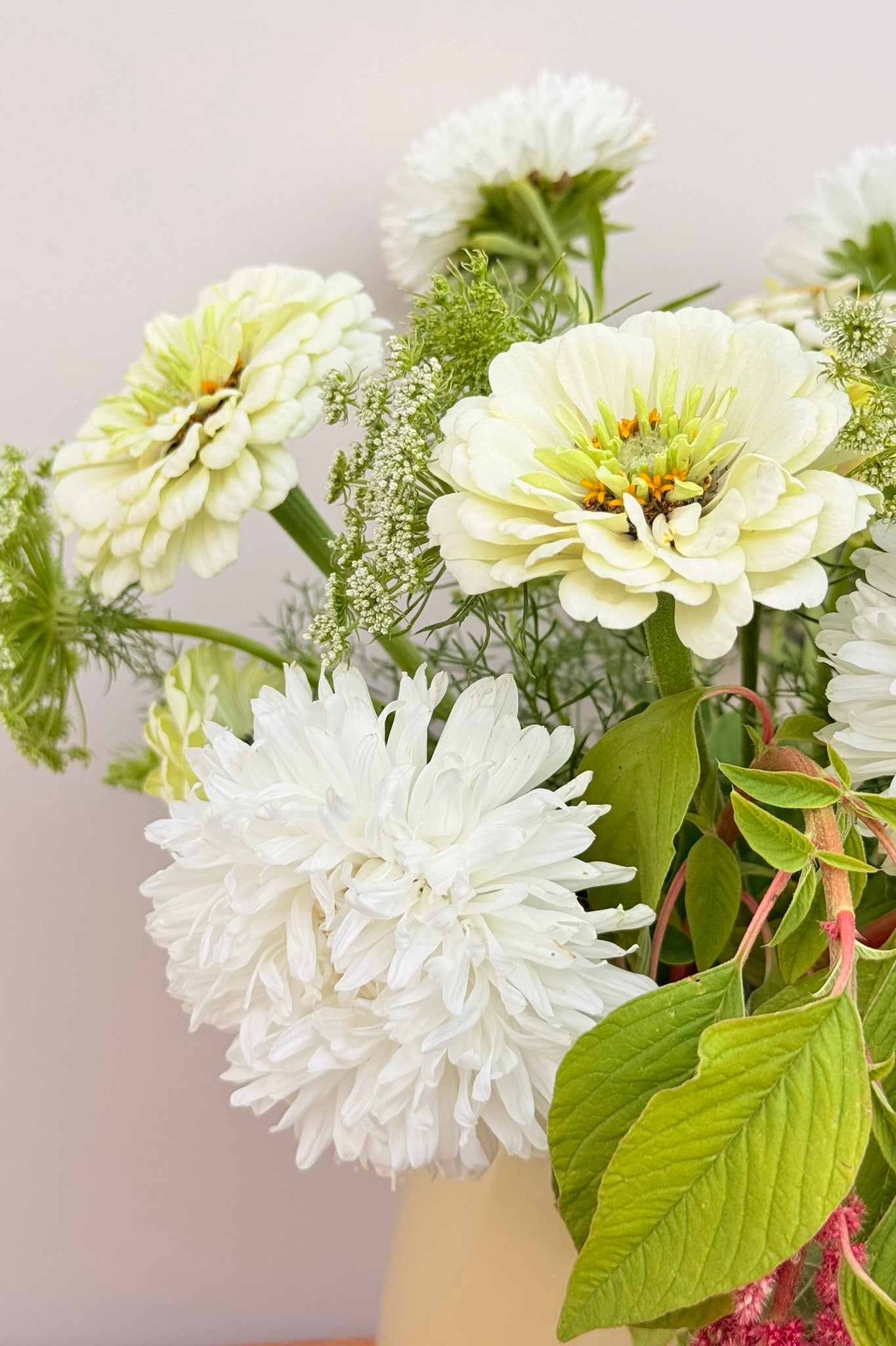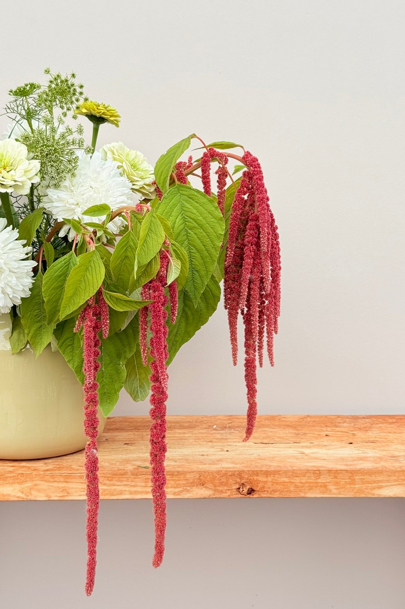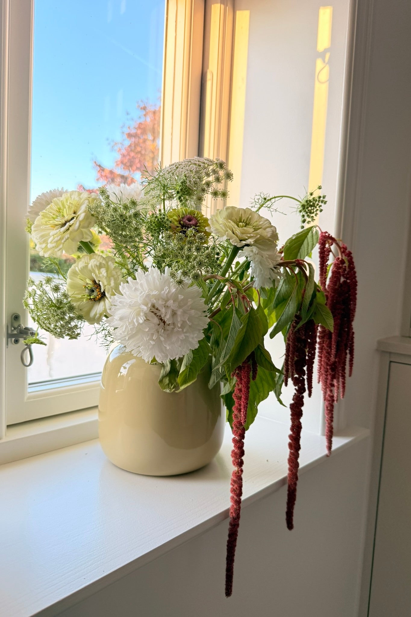 Whimsy Waterfall-buketten har et roligt og afdæmpet udtryk, hvor hvide og grønne nuancer danner helheden, og den smukke amarant får lov at træde i karakter. Sommerasters ’King Size White’ og frøkenhat ’Polar Bear’ giver store blomsterhoveder i hvidt, der danner den lyse base. Frøkenhat ’Queen Lime Blotch’ tilfører et limegrønt skær, som harmonerer med Tandstikkerurt ’Green Mist’, der lægger sig let og luftigt omkring de større blomster og skaber bevægelse. Amarant ’Coral Fountain’ fuldender buketten med sine hængende blomster i varme koraltoner, som giver en markant og elegant kontrast.